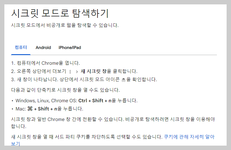 이렇게 검색 기록을 사이트에서 모르도록 하려면 구글 크롬 브라우저를 사용하여 시크릿 모드로 검색을 하면 됩니다.