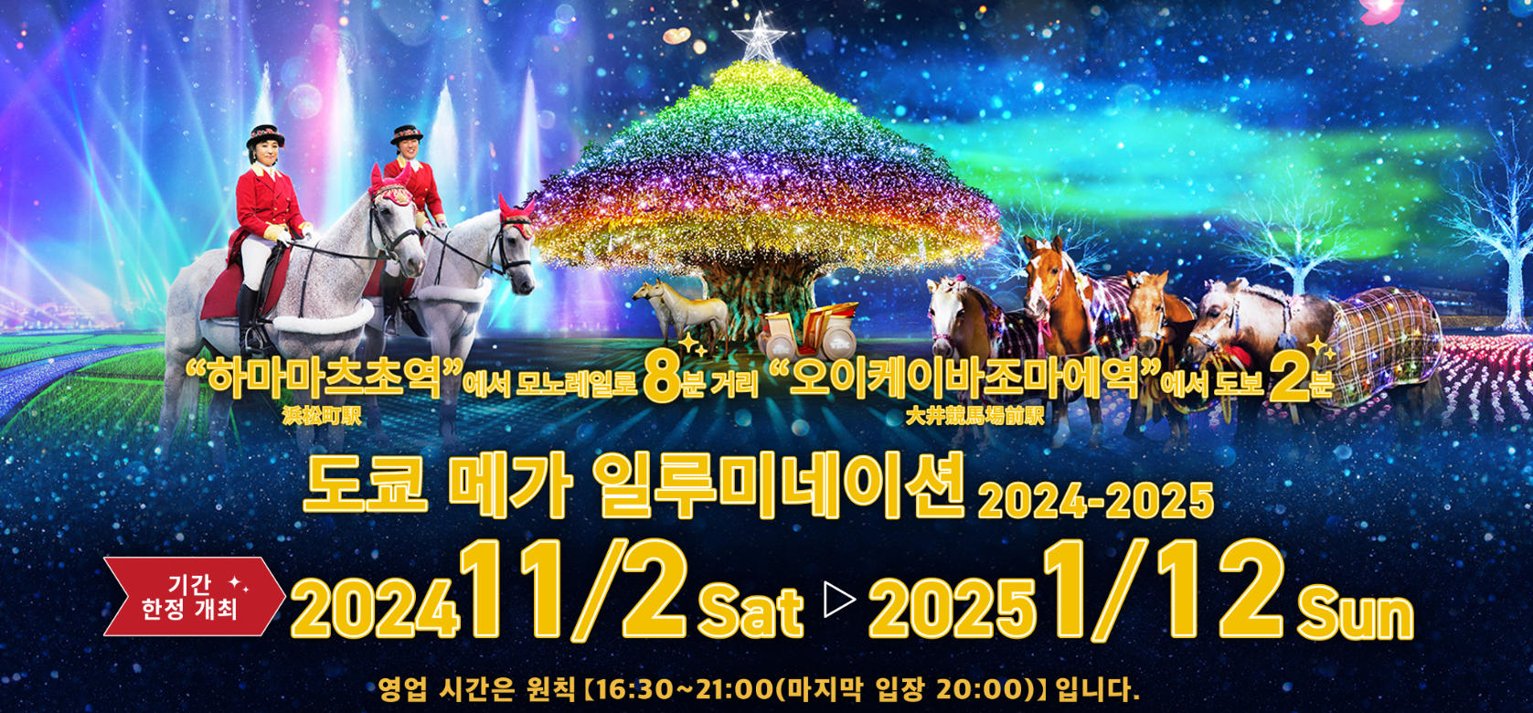 빛과 물기둥이 솟아오르는 분수쇼는 신곡을 도입해 세 가지 연출을 즐길 수 있습니다. 신비로운 '오로라의 숲'과 100m 길이의 빛의 터널 '에도벚꽃터널' 외에 '일본원풍경'과 '후지타나' 등 '화' 테마로 한 일루미네이션도 추천합니다. 리본과 모자로 멋을 낸 '미니어처 호스&포니', 경주할 때 경주마를 유도하는 털빛 고운 '유도마'들을 만날 수 있는 곳도 도쿄 메가루미(오이 경마장)뿐입니다.